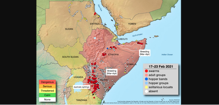 Mappa degli sciami di cavallette in Africa 17-23 febbraio 2021 (Courtesy FAO)