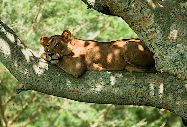 – Leonessa su albero al Queen Elizabeth National Park, Uganda