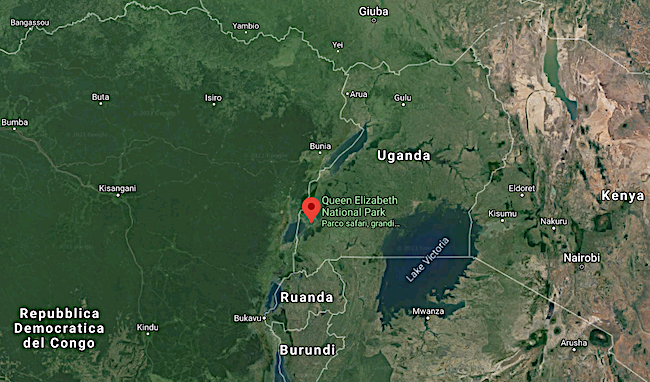 Mappa dell’Uganda. nel pinto rosso il Queen Elizabeth National Park (Courtesy GoogleMaps)
