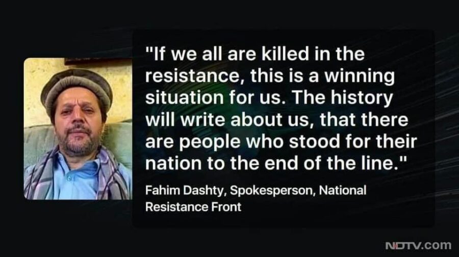 The National Resistance Front of Afghanistan had its first martyr named Moahmmad Fahim Dashty (5 September, 2021) who was a spokesperson of the National Resistance Front. He unlike all the leaders and politicians followed the best of pathways for the national interest of Afghanistan not the best for his personal interest. Panjshir resists alone with all the valley residents.