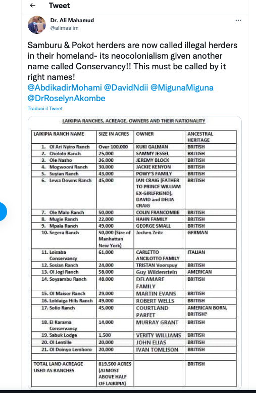 Ma c’è di più. Qualcuno interessato a provocare disordini scheda i proprietari terrieri e sobilla pastori e contadini nella speranza che cresca il loro astio. Hanno buon gioco grazie ai social media che amplificano notizie spesso imprecise, molto più spesso errate e soprattutto infiammatorie degli animi. Ecco, come prova, questo Tweet di un certo Ali Mahamud che all’anagrafe è di identità incerta, e potrebbe essere un politico della contea vicina di Marsabit, o un passato Governatore o un semplice identitario affiliato al campo dell’aspirante Presidente 2022 William Ruto. Ali Mahamud pubblica la lista dei proprietari terrieri tutti regolarmente non Kenioti, con solerzia di dettagli falsi e, a volte, anche coloriti.