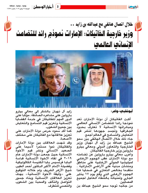 Lo ha affermato durante una telefonata tra Sua Altezza lo sceicco Abdullah bin Zayed Al Nahyan, Ministro degli Affari Esteri e della Cooperazione Internazionale, e il Cardinale Pietro Parolin, Segretario di Stato vaticano.