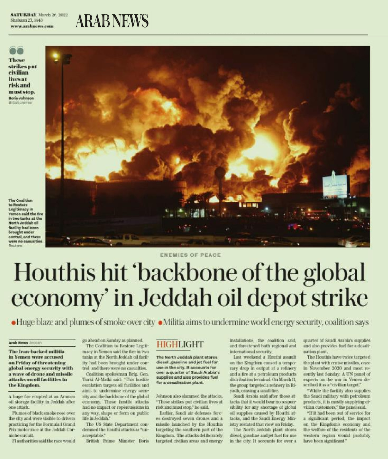 Secondo un portavoce della forze armate saudite, il Generale Turki Al-Malki: “Questa escalation ostile prende di mira gli impianti petroliferi e intende minare la sicurezza energetica e la spina dorsale dell’economia saudita. Sono attacchi ostili che non hanno avuto alcun impatto o ripercussione sulla vita pubblica di Gedda”.