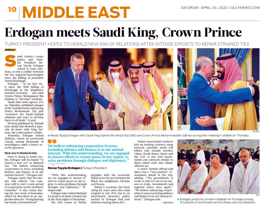 E’ la sua prima visita in Arabia Saudita dal quel lontano 2017, l’anno prima dell’efferato omicidio del giornalista del Washington Post, che ha creato non pochi problemi tra Arabia e Turchia. Dissapori che attualmente si son quasi del tutto diradati, specialmente dopo che il presidentissimo, qualche giorno fa, ha annunciato alla stampa d’aver disposto un decreto ad personamย per sospendere il procedimento legale contro i sospettati dell’omicidio Khashoggi disponendo il trasferimento del processo dalla Turchia all’Arabia Saudita.