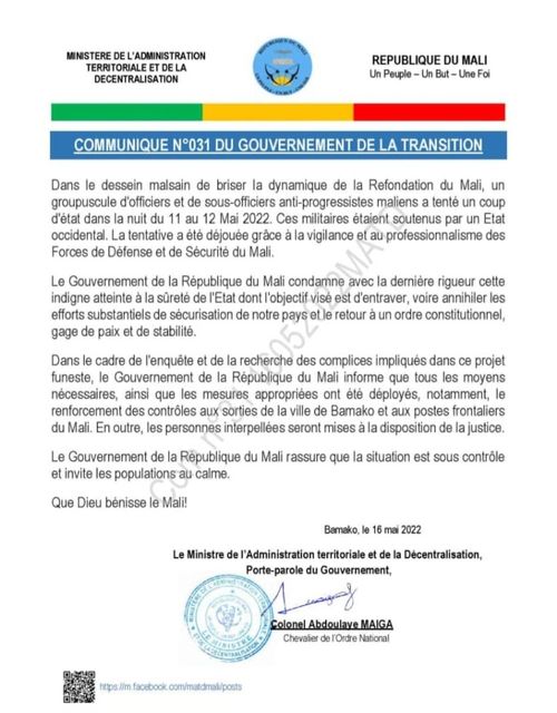 Secondo il comunicato ufficiale delle autorità di Bamako “Il fallito tentativo è stato organizzato da un gruppetto di ufficiali e sottufficiali, sostenuti da uno Stato occidentali”.