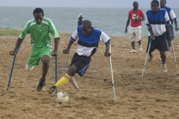 C’è molto pubblico oggi su un tratto di spiaggia in Sierra Leone, dove un gruppo di sostegno ha improvvisato un campo di calcio per persone speciali.