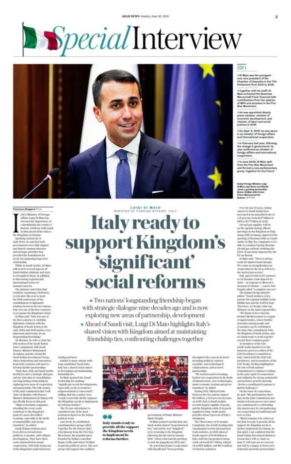 Di Maio ha sottolineato che entro la fine dell’anno l’Italia organizzerà eventi celebrativi per il 90° anniversario delle relazioni diplomatiche con ia l’Arabia Saudita. “L’Italia è stato uno dei primi Paesi a stabilire relazioni diplomatiche con il Regno all’inizio degli anni ’30 e il 2022 segna un anniversario molto importante in questa lunga amicizia”, ha precisato di Maio durante l’intervista.