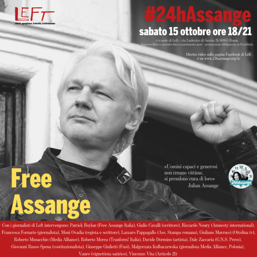 Sabato 15 ottobre, a partire dalle ore 18 e fino alle 21, nella sede romana di Left, un incontro per chiedere la liberazione del fondatore di Wikileaks. Tra i presenti: Moni Ovadia, Vauro, Francesca Fornario, Riccardo Noury. L’evento fa parte di una “24 ore non stop” mondiale sul tema a cui parteciperanno anche il filosofo Noam Chomsky e l’avvocata e moglie di Assange Stella Moris.