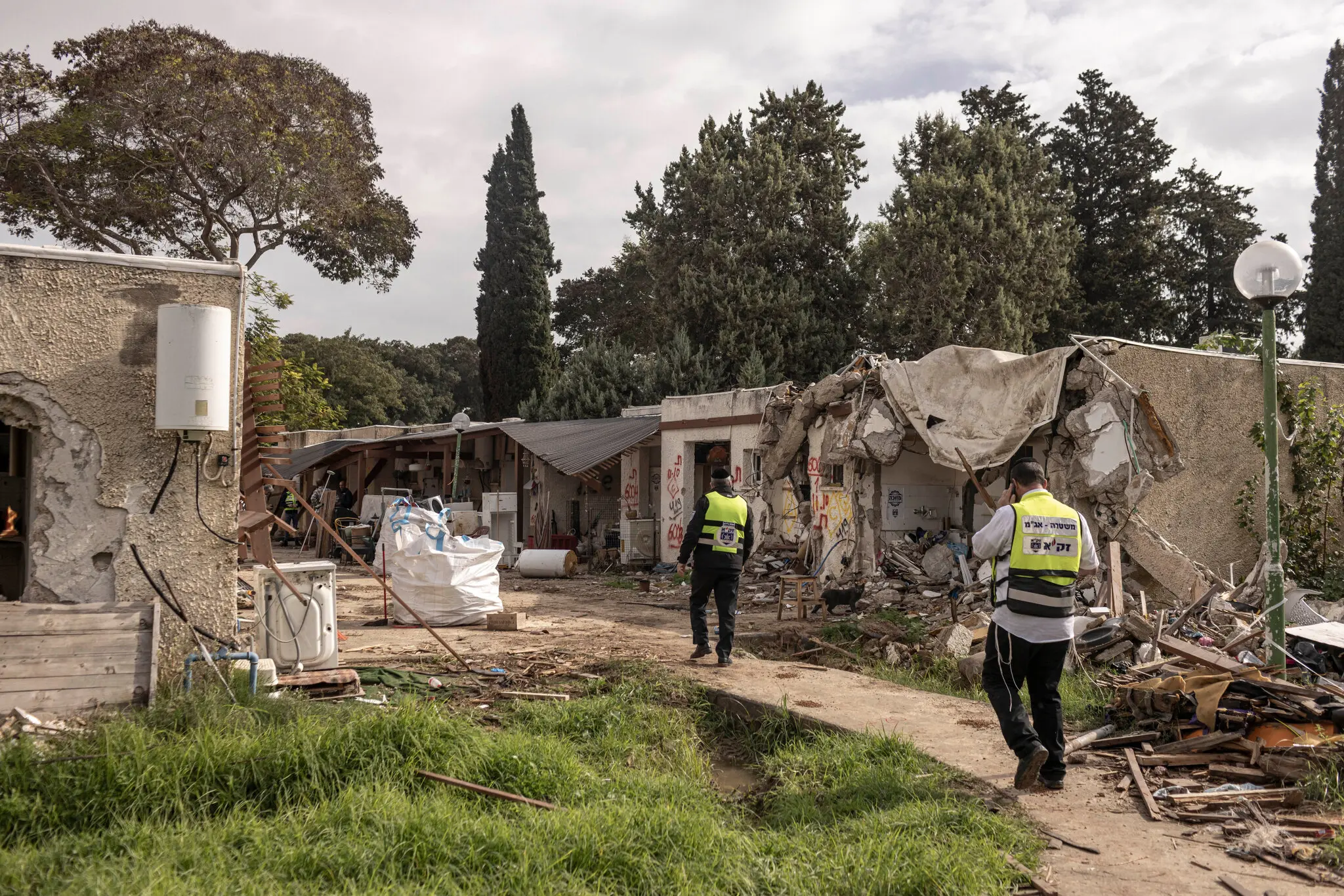 Volontari israeliani visitano il kibbutz Kfar Aza, dopo attacco di Hamas (foto New York Times)