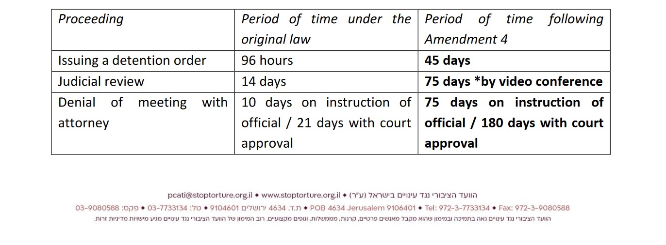 Il Comitato pubblico contro le torture, stoptorture.org.il, con sede a Tel Aviv, già a febbraio 2023 aveva chiesto la fine dell’applicazione dell’emendamento (che sarebbe scaduto a marzo 2024). Secondo stoptorture dal 7 ottobre erano stati fermati almeno 2 mila palestinesi, tra gawawi e cittadini della Cisgiordania, ma le condizioni detentive e di difesa legale anche a Sde Teiman si erano drasticamente ridotte a causa dell’emendamento n. 4: prima di questa norma la detenzione poteva durare un massimo di 96 ore, dopo la sua promulgazione si può arrivare a 45 giorni.