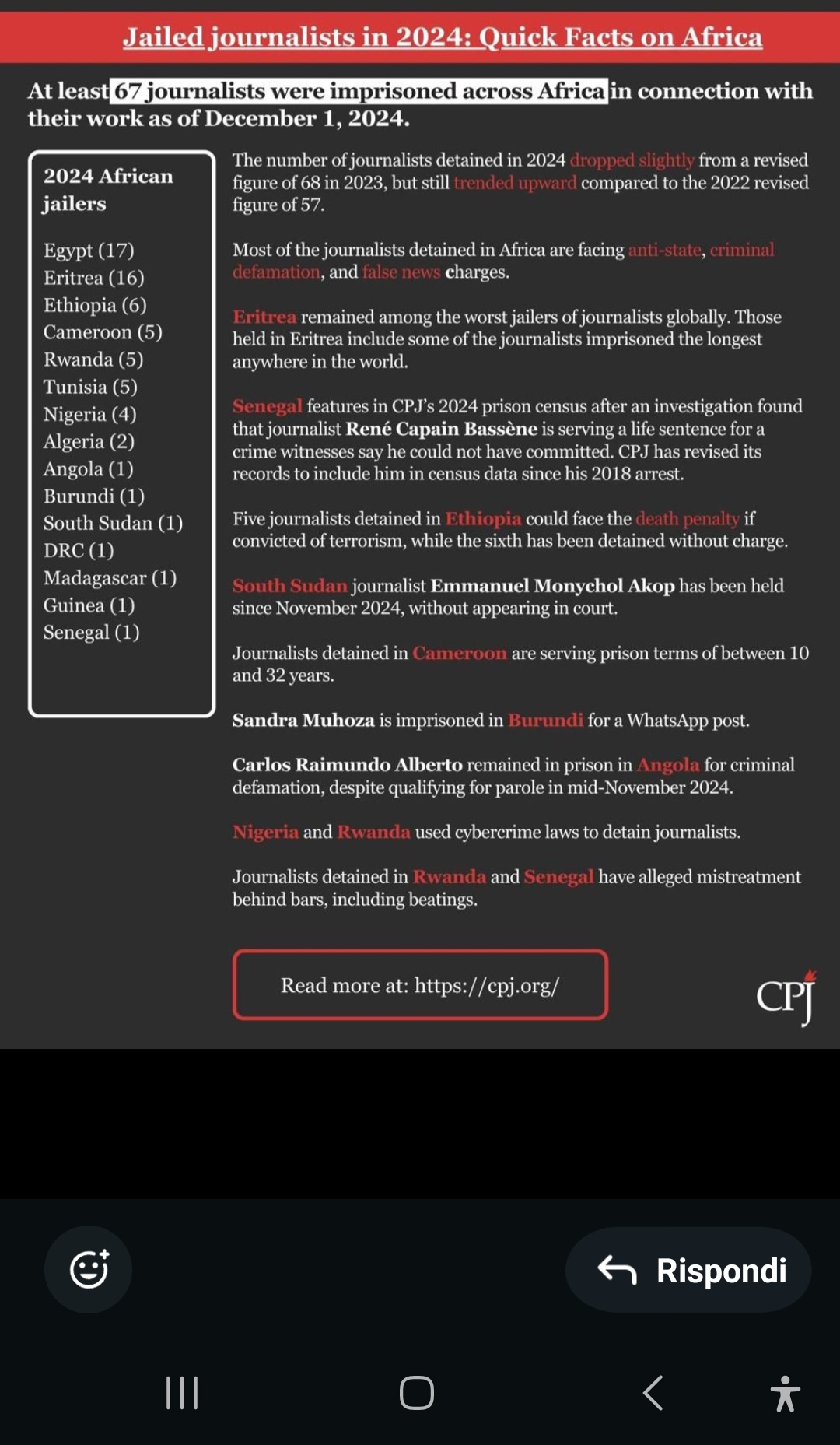 Secondo il rapporto del censimento carcerario del 2024 del Comitato per la protezione dei giornalisti (CPJ), “fino al  1° dicembre 2024 non meno di 67 periodisti erano stati incarcerati in tutta l’Africa in relazione al loro lavoro”.