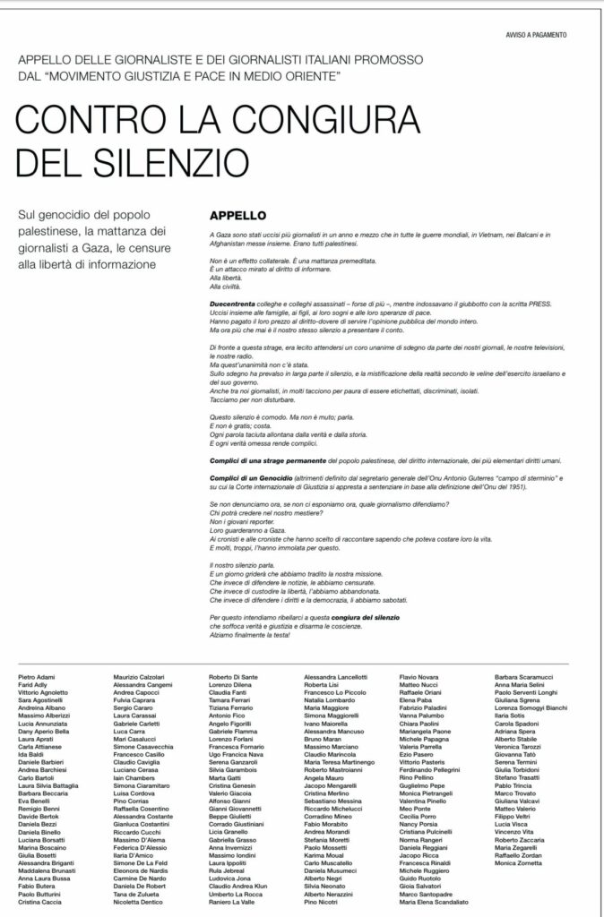 No, su quanto sta accadendo a Gaza, non è possibile più tacere. Starsene zitti è impossibile, impensabile, indecente, spaventoso. Di fronte a questa “congiura” è necessario ribellarsi. Centosettantacinque giornalisti forse sono pochi.