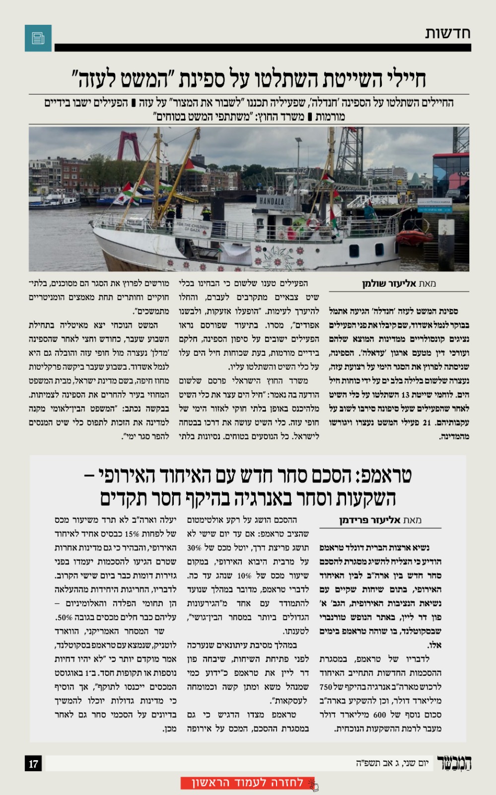 La nave della flottiglia di Gaza, la Khandala, è arrivata al porto di Ashdod a Bukhara, dove gli attivisti sono stati accolti dai rappresentanti consolari dei loro paesi d’origine e dagli avvocati dell’organizzazione Adalah. La nave, che ha tentato di rompere il blocco navale sulla Striscia di Gaza, è stata fermata in mare dalle forze navali israeliane ieri sera. I combattenti della Flotta 13 hanno preso il controllo dell’imbarcazione dopo che gli attivisti a bordo si sono rifiutati di tornare sui loro passi. 21 attivisti della flottiglia sono stati arrestati e saranno espulsi dal paese. Martedì gli attivisti hanno affermato di aver avvistato una nave militare avvicinarsi e di aver iniziato a prepararsi per uno scontro. “Sono scattati gli allarmi e abbiamo indossato i giubbotti antiproiettile”, hanno detto. Nel filmato pubblicato, gli attivisti sono stati visti seduti sul ponte della nave, alcuni con le mani alzate, mentre le forze navali salivano a bordo e ne prendevano il controllo. Ministero degli Affari Esteri La Marina israeliana ha rilasciato una dichiarazione martedì, affermando: “La Marina ha impedito alla nave di entrare illegalmente nella zona marittima di Hofuf. La nave sta viaggiando in sicurezza verso Israele. Tutti i passeggeri sono al sicuro. I tentativi non autorizzati di violare il blocco sono pericolosi, illegali e compromettono gli sforzi umanitari in corso”. La nave in questione ha lasciato l’Italia all’inizio della scorsa settimana, circa un mese e mezzo dopo che la nave “Madeleine” era stata fermata al largo delle coste di Gaza ed era stata anch’essa condotta al porto di Ashdod. La scorsa settimana, l’ufficio del Procuratore Distrettuale di Haifa, per conto dello Stato di Israele, ha chiesto al tribunale distrettuale della città di sequestrare definitivamente la nave. La richiesta recitava: “Il diritto internazionale conferisce allo Stato il diritto di sequestrare le navi che tentano di violare un blocco marittimo”.