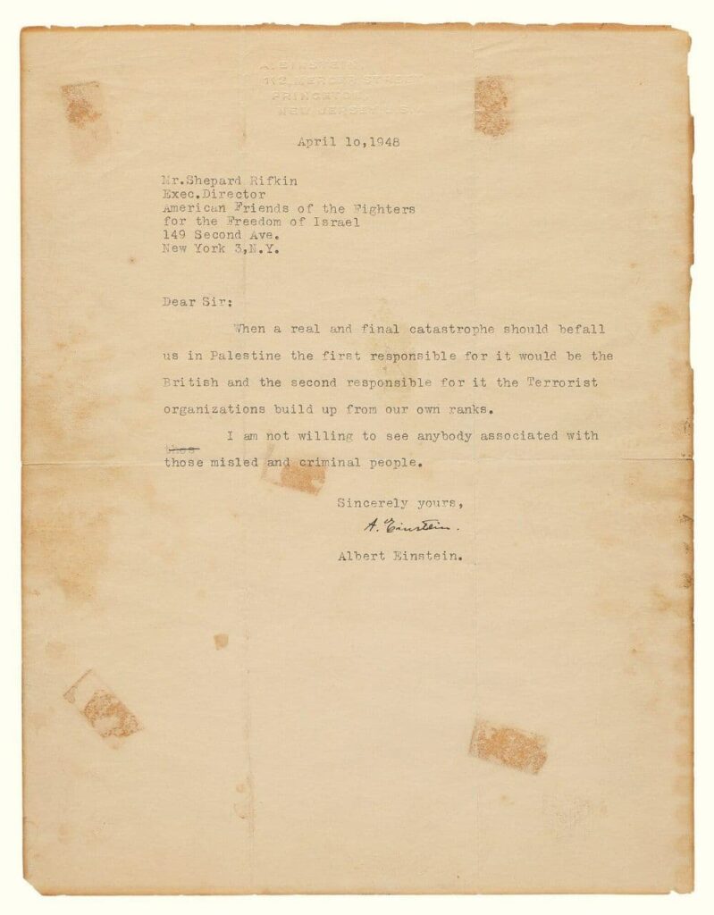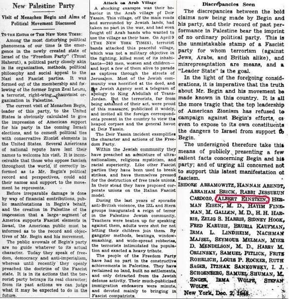 Il 2 dicembre 1948, ventotto intellettuali ebrei, tra i quali Albert Einstein ed Hannah Arendt, inviarono una lettera alla redazione del New York Times per denunciare la deriva violenta e imperialista imposta dal futuro primo ministro Menachem Begin alla natura dello Stato israeliano, fondato nel maggio dello stesso anno.