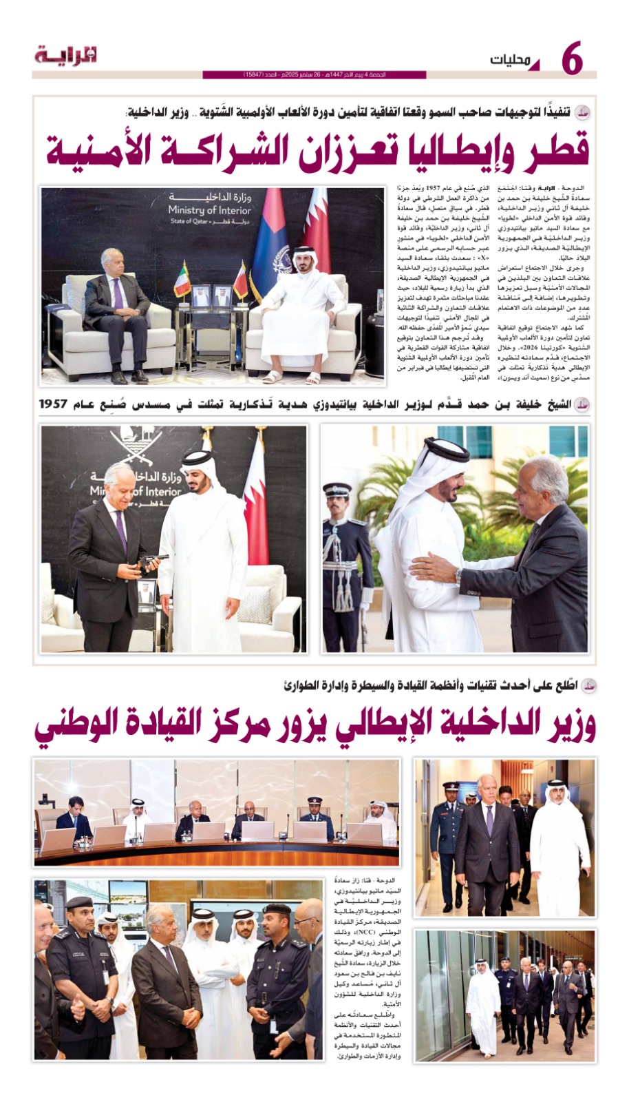 Sua eccellenza è stato accompagnato durante la visita da sua eccellenza lo Sceicco Nayef bin Faleh bin Saud Al Thani, sottosegretario aggiunto del Ministero dell’Interno per gli Affari di Sicurezza, dove sua eccellenza è stata informata sulle ultime tecnologie e sui sistemi avanzati utilizzati nei settori del comando e controllo, della gestione delle crisi e delle emergenze.