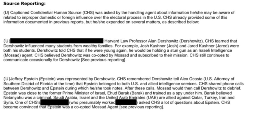 “L’informatore ricorda che Dershowitz disse al giudice distrettuale della Florida, Alex Ocasta, che Epstein apparteneva sia ai servizi di intelligence americani, sia a quelli alleati. La fonte ha precisato di aver ascoltato telefonate tra Dershowitz e Epstein, durante le quali era anche riuscita/o a prendere appunti. Dopo queste conversazioni il Mossad chiamava Dershowitz per fare il punto. Epstein era anche vicino al primo ministro israeliano, Ehud Barak, che lo aveva formato allo spionaggio. Arabia Saudita, Israele ed Emirati sono alleati contro il Qatar, la Turchia, Iran e Siria. Dopo domande insistenti da parte di un soggetto (nome oscurato) la fonte maturò la convinzione che Epstein lavorasse come agente del Mossad”.