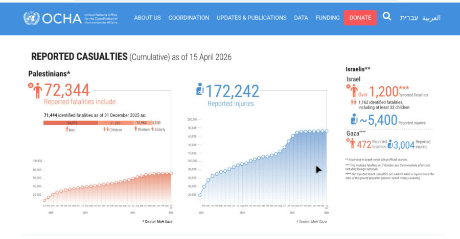 In base a un rapporto di OCHA (Ufficio dell’Onu per il coordinamento degli Affari Umanitari) di pochi giorni fa,i decessi documentati da parte palestinese e dal governo israeliano, a Gaza sarebbero morte ben 72.400 persone di cui 21.283 bambini e 1.200 israeliani, tra loro 33 bimbi.