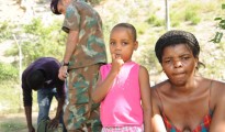 A group of Eritreans lines up outside a small, green army tent surrounded by yellow scrubland at the top...